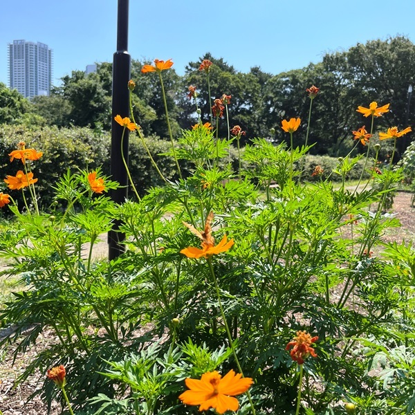 キバナコスモスに、同じ色の蝶が来ていた。