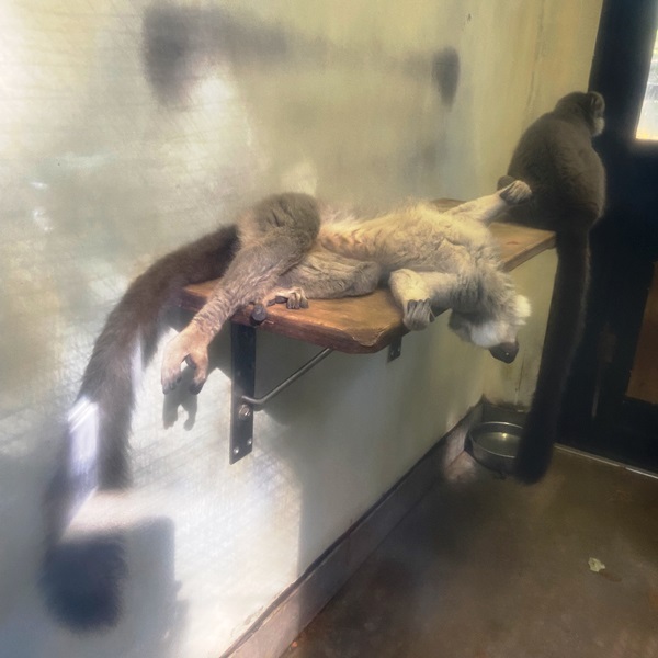 ブラウンキツネザルが仰向けでゴロン。