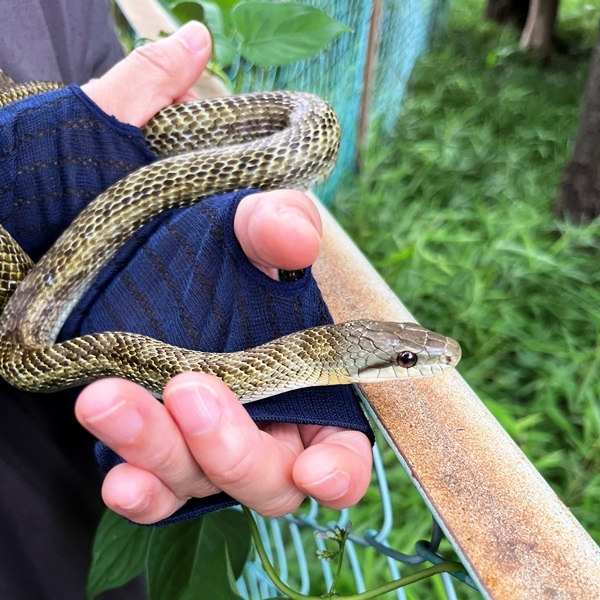 今年もアオダイショウを見つけたので、動物たちから離れた場所に移しておいた。