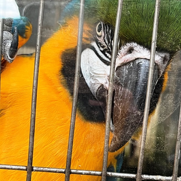ルリコンゴウインコのコウ♂は目の前に来てくれるので、アップで対面可能。(相棒のコン♂は、まだバックヤードで過ごしているのかな?)